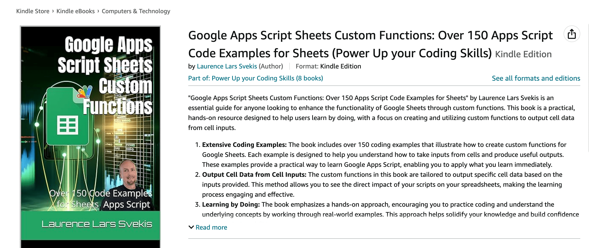 Book Source Code on GitHub https://github.com/lsvekis/Sheets-Custom-Formulas-Book Get the Best Selling Book Free for the next 4 days US https://www.amazon.com/dp/B0D59Q4J1T CAN https://www.amazon.ca/dp/B0D59Q4J1T 1 : Mastering Basic Custom Functions In this opening chapter, we introduce the foundational concepts of Google Apps Script for custom functions in Google Sheets. Begin by learning how to create simple functions that … Read more