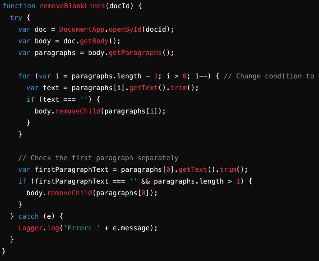 In this blog post, we will explore how to fix and improve a function written in Google Apps Script that removes blank lines from a Google Docs document. This can be particularly useful for cleaning up documents with unnecessary blank lines. Original Function Here is the original removeBlankLines function: function removeBlankLines(docId) { try { var … Read more