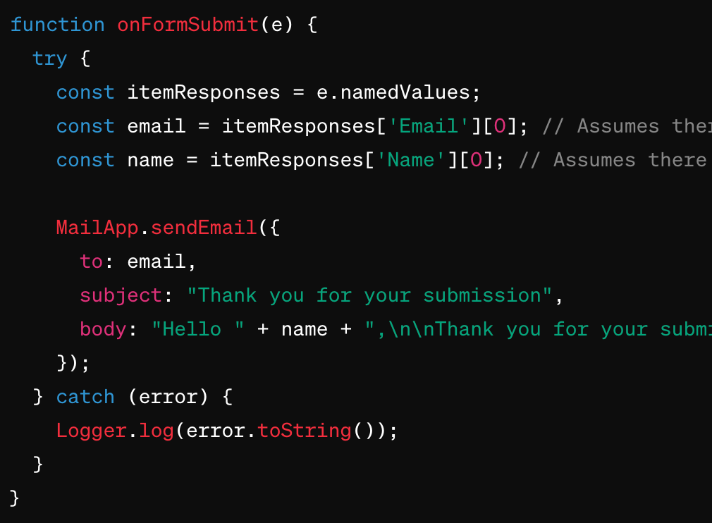 To set up a trigger for the function onFormSubmit(e) which automatically sends an email to a user after they submit a form, you’ll first need to write the function as part of a Google Apps Script project linked to your Google Form or Sheet. Then, you’ll create a trigger that fires every time the form … Read more