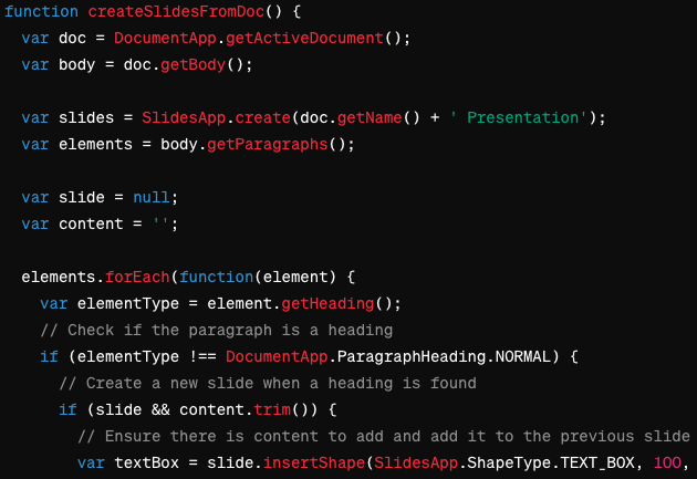 Creating presentations from lengthy documents can be a tedious task, especially when you need to transfer key points and sections manually. This blog post will guide you through automating the process using Google Apps Script, enabling you to convert sections of a Google Docs document into a series of slides on a Google Slides presentation.
