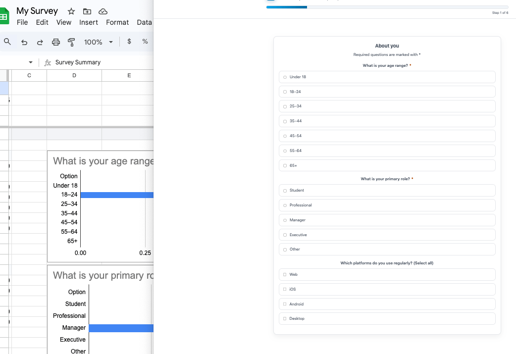 - (Optional) Summary.gs: generates a Summary sheet with charts and a Verbatims tab for open-text answers.