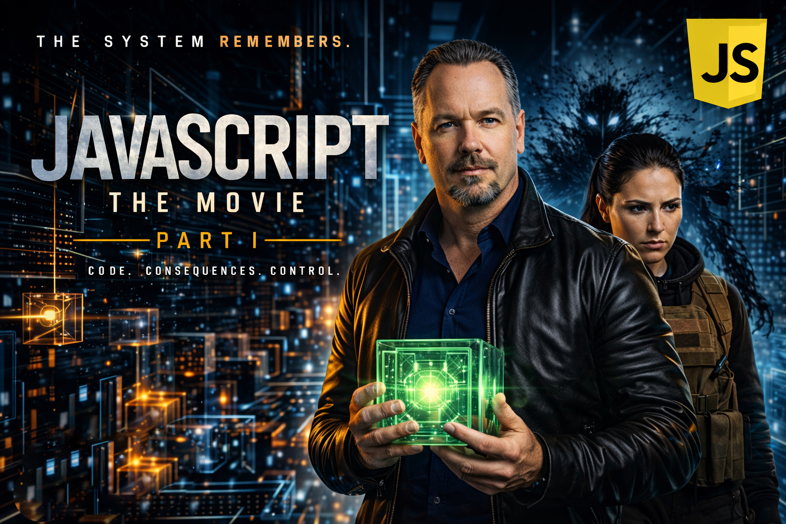 Instead of telling learners what JavaScript does, the movie shows what happens when code logic becomes the rules of a world.